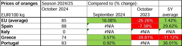 Il Portogallo ha registrato a ottobre prezzi delle arance pari a 83 euro/100 kg, con un modesto aumento dello 0,92% rispetto al mese precedente. Questi prezzi sono superiori del 36,01% rispetto alla media quinquennale, il che indica una performance di mercato piuttosto stabile rispetto ad altri Paesi dell'Ue. Al contrario, l'Italia non ha segnalato dati specifici sui prezzi delle arance per il periodo, limitando confronti regionali più ampi.