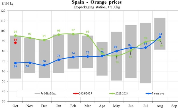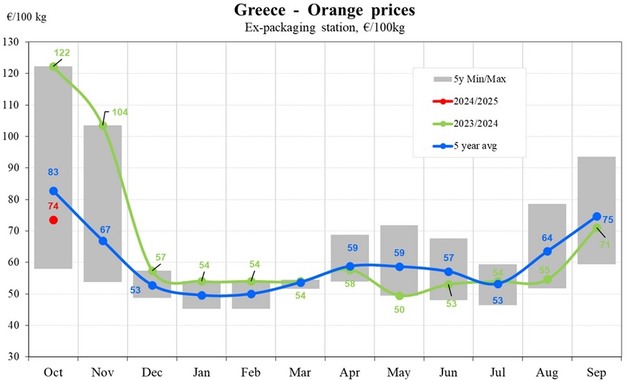 La Spagna, uno dei principali produttori di agrumi nell'Ue, ha registrato prezzi delle arance pari a 88 euro/100 kg, con una diminuzione significativa del 7,38% rispetto allo stesso periodo dell'anno scorso, sebbene i prezzi rimangano superiori del 29,62% rispetto alla media quinquennale. Nel frattempo, in Grecia i prezzi delle arance sono scesi a 74 euro/100 kg, con un brusco calo del 39,81% su base annua e dell'11,12% rispetto alla media quinquennale, suggerendo persistenti problemi di approvvigionamento e una debole domanda di mercato.