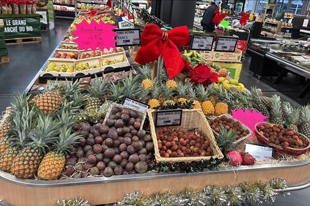 Con il desiderio di offrire prodotti biologici coltivati il più possibile localmente, i litchi e gli ananas Victoria provengono dall'Isola di Reunion, i frutti della passione dalla Spagna e gli ananas dalle Azzorre in Portogallo. "Oltre a questi prodotti esotici, offriamo naturalmente un'ampia gamma di agrumi, tra cui i mandarini Clemenvilla, le arance di diverse varietà (Tarocco, Moro, a foglia) e i limoni di Siracusa, che provengono direttamente da un produttore della Sicilia, così come le clementine, che arrivano direttamente da un produttore della Corsica, anche se la fine della stagione si avvicina. Dalla Corsica riceviamo anche i pomelo rossi".