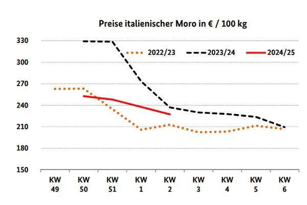 La gamma delle arance bionde è stata dominata dall'offerta spagnola, con la disponibilità soprattutto di Navel e Navelina. Sono state disponibili anche alcune Salustiana. La Salustiana è arrivata dal Marocco, mentre diverse varietà di Navel provenivano dalla Grecia. Secondo BLE, le Washington Navel turche e le Baladi e le Valencia Late egiziane hanno avuto un ruolo supplementare, mentre le partite italiane non hanno superato lo status di complementari. I lotti sudafricani sono scomparsi sempre di più dal mercato e in alcune piazze hanno rivelato inadeguatezze qualitative.