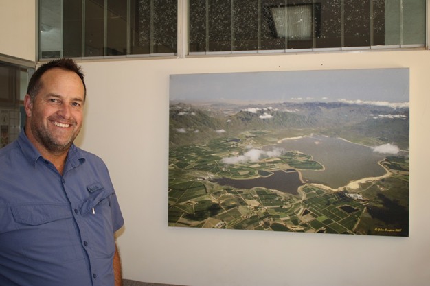 Justin Mudge e una veduta aerea della Chiltern Farms che costeggia la diga di Theewaterskloof