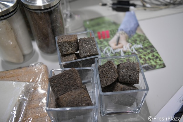 RizaPower ha portato in mostra substrati particolari, spugnosi, richiesti specialmente da vivaisti e lavoratori di micropropagazione. Grazie a tali zollette (mix di torbe, cocco e perlite), si evitano ristagni di acqua, si migliora la radicazione e si aumenta la resa in numero di piante per superficie.