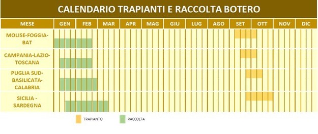 Questo ibrido viene consigliato per tutte le maggiori aree di produzione italiane del finocchio.La tabella di seguito, riportante il calendario di trapianto e raccolta, suggerisce il miglior collocamento del prodotto nei diversi areali di coltivazione.