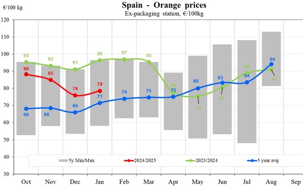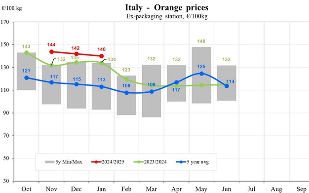 L'Italia rimane il mercato con le quotazioni più alte per le arance. I prezzi mostrano un calo graduale, ma restano ben al di sopra degli altri Paesi. A novembre, le arance avevano un prezzo di 144 euro/100 kg, per poi scendere leggermente a 142 euro/100 kg a dicembre e a 140 euro/100 kg a gennaio. Nonostante la flessione, i prezzi dell'Italia rimangono costantemente più alti della media quinquennale e riflettono il posizionamento premium del Paese nel mercato agrumicolo. Una forte domanda interna e costi di produzione più elevati probabilmente contribuiscono a tali quotazioni elevate.