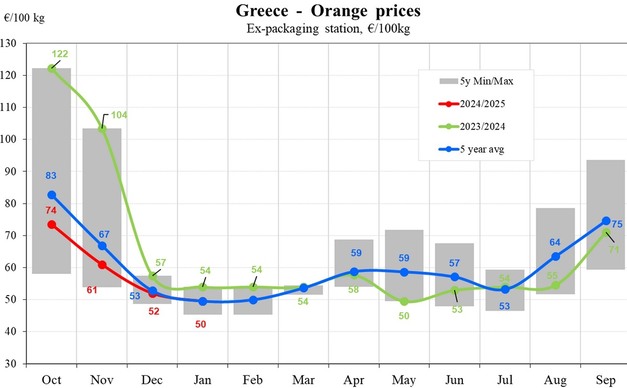 In Grecia, i prezzi delle arance hanno subito un forte calo, riflettendo le pressioni del mercato e l'abbondante offerta. I prezzi di novembre erano di 61 euro/100 kg, ma a dicembre sono scesi a 52 euro/100 kg e fino a 50 euro/100 kg a gennaio. Tali cifre collocano la Grecia tra i mercati delle arance con i prezzi più bassi, notevolmente indietro rispetto agli altri Paesi europei. Il contrasto con la stagione precedente è netto, poiché allora i prezzi avevano raggiunto il picco di oltre 120 euro/100 kg a ottobre, prima di flettere bruscamente.