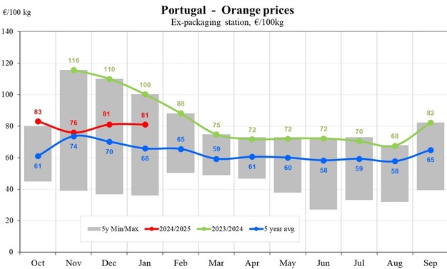 In Portogallo, l'andamento dei prezzi delle arance si è mantenuto relativamente stabile rispetto ad altre nazioni europee. A novembre, la quotazione si attestava a 76 euro/100 kg, per poi aumentare leggermente a 81 euro/100 kg a dicembre e gennaio. Sebbene inferiori a quelli dell'Italia, questi prezzi sono comunque superiori a quelli della Grecia e in linea con il mercato della Spagna. La stabilità del mercato portoghese si riflette in una variazione più contenuta dei prezzi, sostenuta da una domanda moderata che contribuisce a mantenerli costanti.