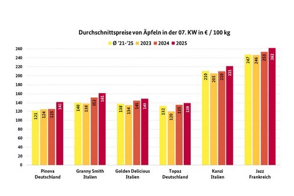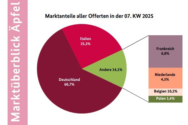 Le varietà domestiche hanno continuato a costituire la base dell'offerta di mele. Per lo più sfuse, ma anche presentate in casse, Elstar, Boskoop, Tenroy e Braeburn hanno solitamente catturato sufficiente attenzione. Secondo il rapporto BLE della settimana 7 del 2025, nel complesso la disponibilità dei carichi nazionali è leggermente diminuita. Le principali varietà provenienti dall'Italia sono risultate le Pink Lady, Granny Smith e Golden Delicious. La Francia ha inviato principalmente varietà club, sempre presentate in cassette a più strati, come Jazz, Honeycrunch e Pink Lady. Le forniture dai Paesi Bassi, dal Belgio e dalla Polonia sono state di natura supplementare.