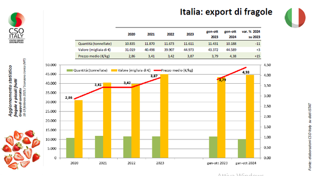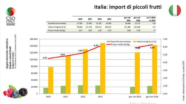 L'Italia si colloca come un paese importatore di piccoli frutti più che come un produttore, con circa 22.712 tonnellate importate nel 2024, con incremento di circa il 10% di volumi importati rispetto al 2023, che si traducono in un incremento a valore pari a 17%.