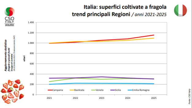 Anche nel 2025 la fragolicoltura italiana risulta concentrata per la maggiore in due regioni del sud Italia, Campania e Basilicata. Queste ultime da sole superano il 50% del totale nazionale, con la Campania che rappresenta il 27% della fragolicoltura nazionale, mentre la Basilica il 26%.