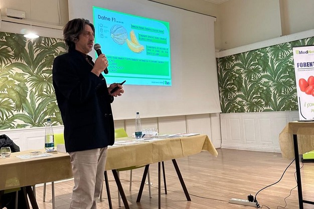 Infine, il Product Manager Cucurbitacee, Francesco Savarino, ha presentato la gamma melone e anguria, che ha richiamato l'attenzione della platea con i meloni retati Minerva ed Ecuba. Entrambe le varietà presentano ottima LSL e sono a polpa rossa. Ecuba, inoltre, è adatto ai trapianti tardivi e mantiene una pezzatura entro i limiti commerciali. Presentato anche il melone gialletto Hator, idoneo ai trapianti precoci e medi. Infine sono state esposte le caratteristiche delle angurie seedless Amaranta (Mini a buccia Crimson) e Bellota (Midi a buccia nera), per trapianti medi e tardivi in tunnellino e pieno campo.