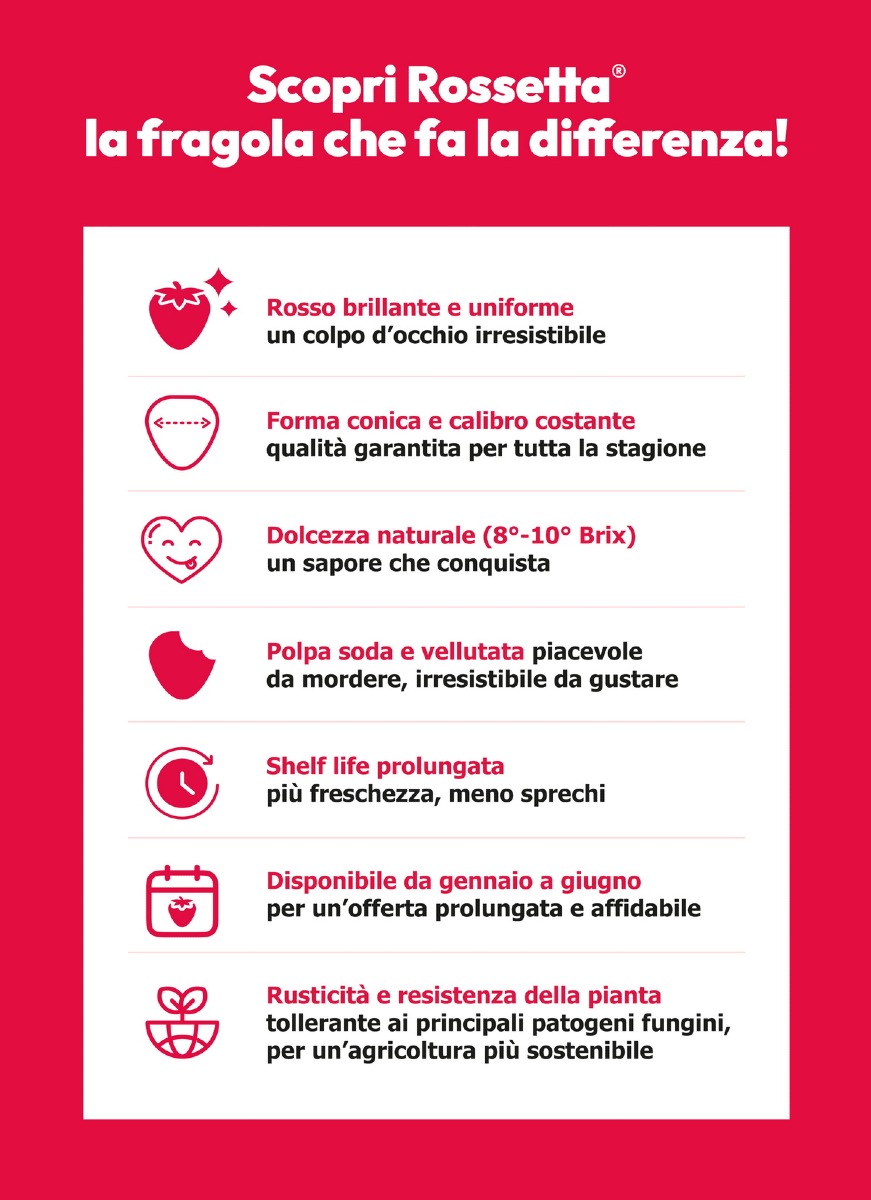 Con Rossetta, NSG sviluppa un progetto di valorizzazione pensato per differenziarsi in un mercato altamente competitivo, presidiato da pochi marchi. In questo contesto, il brand mira a rafforzare il posizionamento di una fragola premium, rispondendo alla crescente domanda di prodotti di alta qualità.