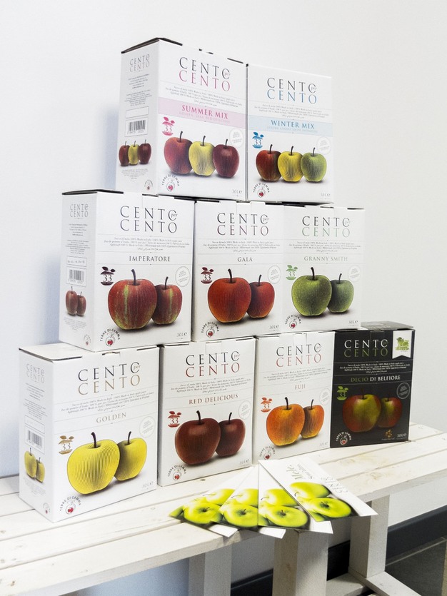 Dall'esperienza e dalla passione per la mela del Consorzio Ortofrutticolo di Belfiore nasce la linea di succhi CentoperCento, un concetto di prodotto dove l'attenzione al processo produttivo, che è e rimarrà sempre artigianale, porta ad un succo 100% di mela senza acqua, zuccheri, coloranti o conservanti aggiunti. Il frutto viene pressato, pastorizzato e confezionato in bag in box da tre litri che permette di mantenere inalterate le proprietà fino a 60 giorni dall'apertura.
