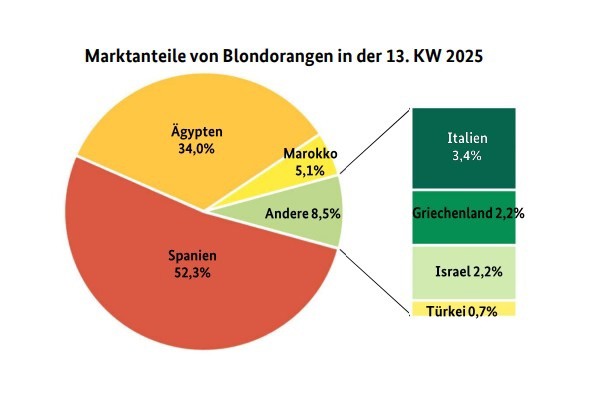 Secondo il rapporto di mercato BLE, della settimana 13 del 2025, le arance Washington Navel turche hanno perso gran parte della loro importanza, e sono state importate solo sporadicamente e, in alcuni casi, sono completamente scomparse dal mercato. Anche la presenza delle arance Salustiana marocchine è diminuita.