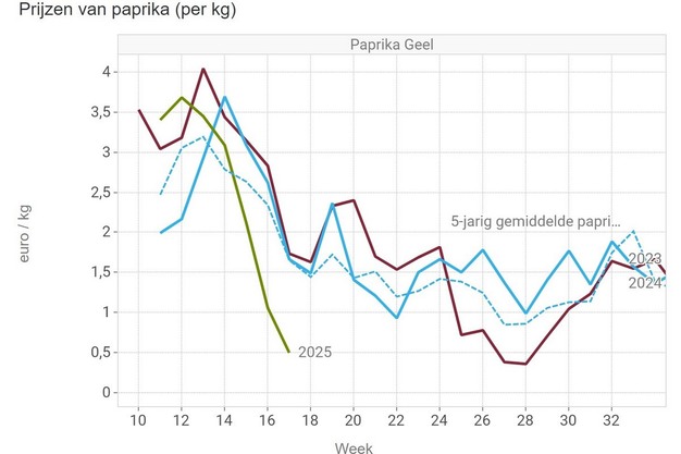 In Belgio, nella settimana 17, i prezzi dei peperoni sono crollati e anche quelli dei pomodori hanno subito un ulteriore ribasso. Il prezzo dei cetrioli è tornato a salire, secondo i nuovi dati sui prezzi medi dell'Associazione delle cooperative orticole belghe (VBT).