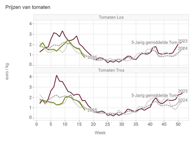 © Agentschap Landbouw en Zeevisserij – Landbouwcijfers: www.vlaanderen.be/landbouwcijfersNella settimana 17 anche i prezzi dei pomodori erano inferiori alla media quinquennale, con 0,75 euro/kg per quelli sfusi e 0,765 euro per quelli a grappolo.