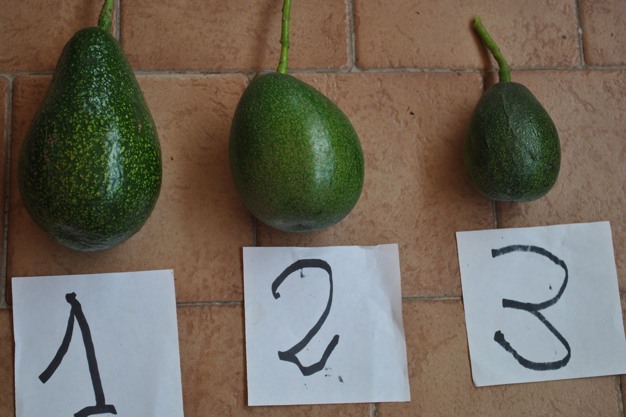 Frutti di avocado della piantagione di Sabaudia da semenzale e frutti ottenuti da tre varietà selezionate; tre frutti della n. 1 pesano un chilo