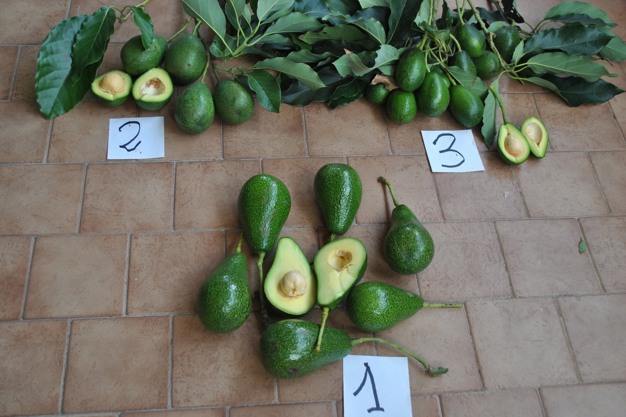 Frutti di avocado della piantagione di Sabaudia da semenzale e frutti ottenuti da tre varietà selezionate; tre frutti della n. 1 pesano un chilo