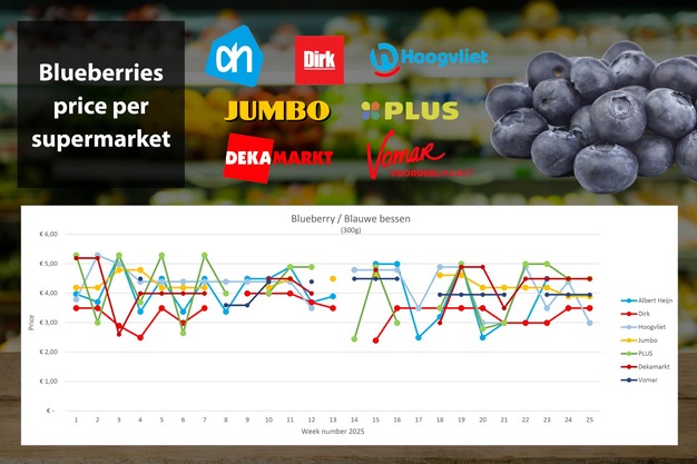 Nella settimana precedente era emerso che i prezzi dei mirtilli si stavano uniformando. Nella settimana 25, i prezzi si mantengono stabili. Tuttavia, da Hoogvliet c'è spazio per un'offerta importante: i mirtilli passano da 4,39 euro a 2,99 euro online.