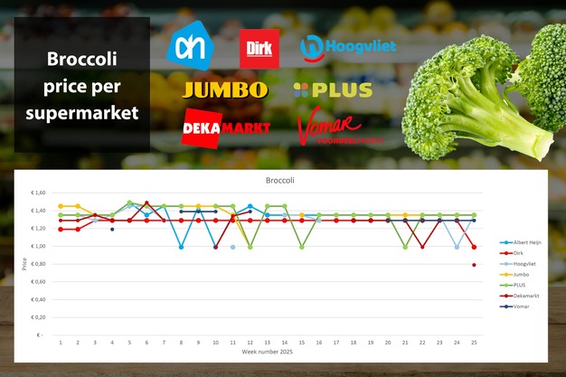 Dopo una settimana di assenza, i broccoli tornano in offerta nella settimana 25 con una presenza rilevante nell'assortimento online di DekaMarkt, a 0,79 euro per 500 g. Il prezzo fisso resta al livello della settimana 23, ovvero 1,29 euro. Dirk si distingue con un ribasso di 0,30 euro, portando il prezzo fisso a 0,99 euro.