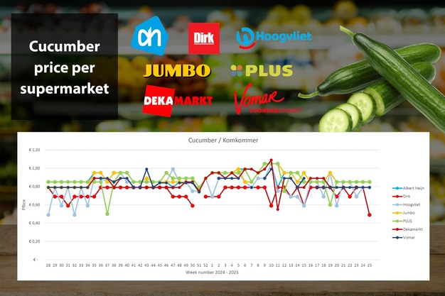 I dati sui prezzi provengono da Supermarktscanner.nl e si basano sui prezzi dei negozi online di Albert Heijn, Jumbo, Plus, DekaMarkt, Dirk e Hoogvliet. La quotazione indicata è una media, comprese le promozioni. In questo confronto non sono stati considerati origine e qualità. La maggior parte dei supermercati non indica queste informazioni sui propri siti web, a eccezione di Hoogvliet e Jumbo, che segnalano il Paese d'origine. È quindi possibile che nel confronto dei prezzi sopra siano stati confrontati avocado acerbi con maturi e cetrioli spagnoli con olandesi.