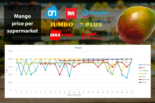 Le offerte sui mango da Albert Heijn e Dirk sono terminate e i prezzi sono tornati ai livelli precedenti. I mango da Dirk e Hoogvliet presentano il prezzo più basso, ovvero 1,79 euro al pezzo. Le altre catene restano appena sotto i 2 euro per frutto.