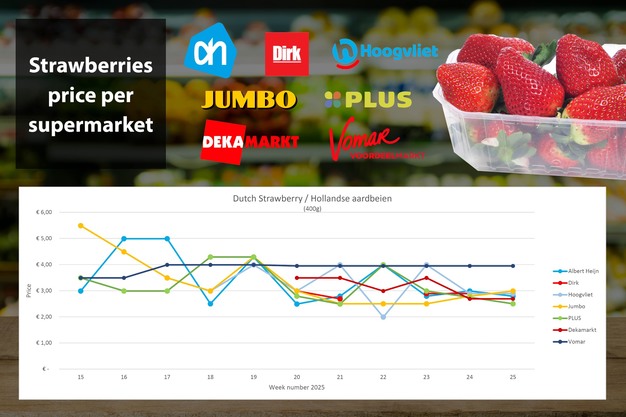 Albert Heijn e Plus hanno abbassato nuovamente il prezzo per una vaschetta di fragole, che arriva rispettivamente a 2,79 euro e 2,50 euro per 400 grammi (in offerta). Jumbo invece aumenta il prezzo di 0,20 euro, portandolo a 2,99 euro, ma le fragole restano comunque in promozione. Sorprende il fatto che Dirk non si distingua per le offerte sulle fragole, né per il prezzo più basso (2,89 euro). Questo "titolo" spetta nella settimana 25 a DekaMarkt, che propone il frutto, come la settimana precedente, a 2,69 euro. Vomar si fa notare per il prezzo più alto: 3,95 euro.