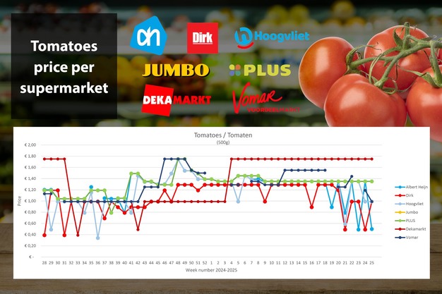 Hoogvliet, Albert Heijn e Dirk continuano ad alternarsi con offerte sui pomodori a grappolo. Nella settimana 25 è il turno di Albert Heijn: 500 grammi a 0,50 euro, leggermente più del prezzo promozionale di Dirk della settimana 24 (0,49 euro). Anche se i pomodori a grappolo non sono sempre disponibili online da Vomar, nella settimana 25 la catena ne abbassa il prezzo di 0,20 euro, portandolo a 0,99 euro (per 500 grammi).