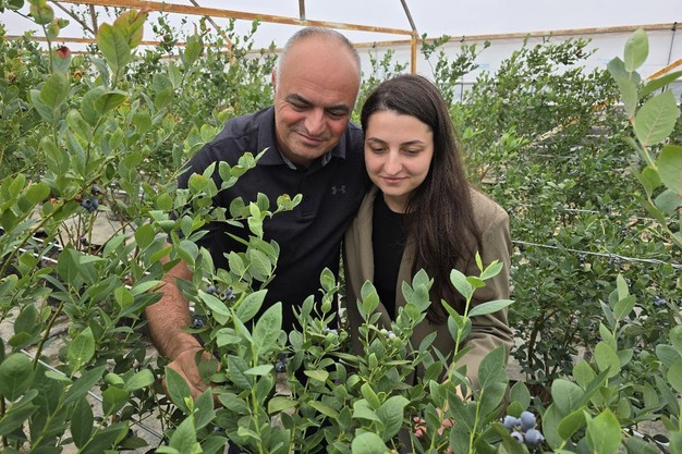 Ana Inashvili e suo padre Giorgi ispezionano il raccolto di mirtilli all'inizio di giugno