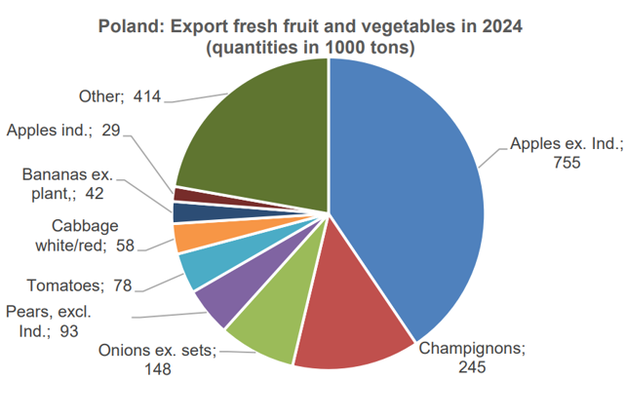 Le mele sono il principale prodotto polacco di esportazione di frutta e verdura fresca. Nel 2024 sono state esportate 755mila tonnellate, destinate in gran parte ai Paesi Ue, con Germania e Paesi Bassi come principali acquirenti. Le esportazioni verso Paesi extra-Ue sono calate bruscamente, da 425mila tonnellate nel 2021 a 280mila nel 2024. Al di fuori dell'Ue, Egitto, Kazakistan e India sono stati i principali acquirenti lo scorso anno. I funghi sono il secondo prodotto più esportato, con 245mila tonnellate esportate nel 2024, lo stesso volume dei due anni precedenti. Germania e Regno Unito sono i principali acquirenti di funghi polacchi, seguiti dalla Francia. Altre esportazioni rilevanti sono cipolle, pere, pomodori e cavoli.