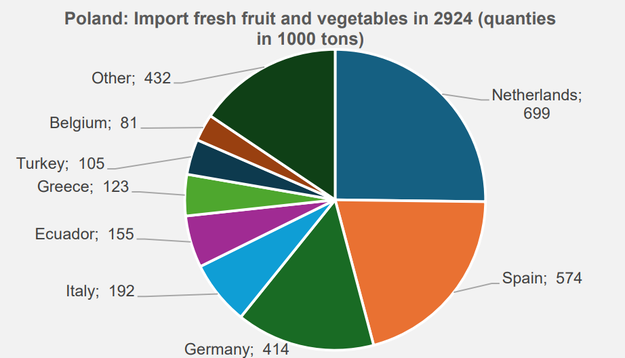 I volumi di importazioni dai Paesi Bassi variano di anno in anno, soprattutto per le cipolle. Nel 2022 le importazioni di cipolle dai Paesi Bassi hanno raggiunto 175mila tonnellate, mentre quelle di banane hanno superato le 140mila. Le importazioni di pomodori hanno continuato a crescere, soprattutto nell'ultimo anno. Spagna e Germania sono gli altri principali fornitori di frutta e verdura fresca per la Polonia. Complessivamente, le banane rappresentano la principale importazione della Polonia, seguite da pomodori, angurie, cipolle, mandarini, arance, limoni e uva.