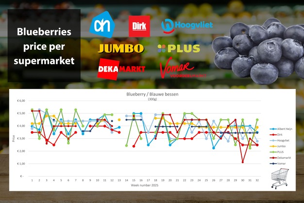 Andamento sorprendente nel reparto mirtilli: se nella settimana 29 Plus aveva drasticamente abbassato i prezzi, ora sono tornati a 4,49 euro. Scenario opposto da DekaMarkt, dove dallo stesso periodo il prezzo è stato ridotto di 2 euro, arrivando a 2,49. Per il resto, le quotazioni nei supermercati rimangono relativamente stabili, con Dirk e Hoogvliet che hanno deciso di proporre i mirtilli in promozione.