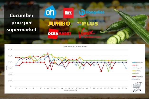 I dati sui prezzi provengono da Supermarktscanner.nl e si basano sui prezzi online nei negozi web di Albert Heijn, Jumbo, Plus, DekaMarkt, Dirk e Hoogvliet. Il prezzo riportato è una media che include anche le promozioni. In questa comparazione non si tiene conto di origine e qualità, poiché la maggior parte dei supermercati non fornisce queste informazioni sui propri siti. Solo Hoogvliet e Jumbo indicano il Paese d'origine. È quindi possibile che si confrontino, ad esempio, avocado acerbi con maturi, o cetrioli spagnoli con quelli olandesi.