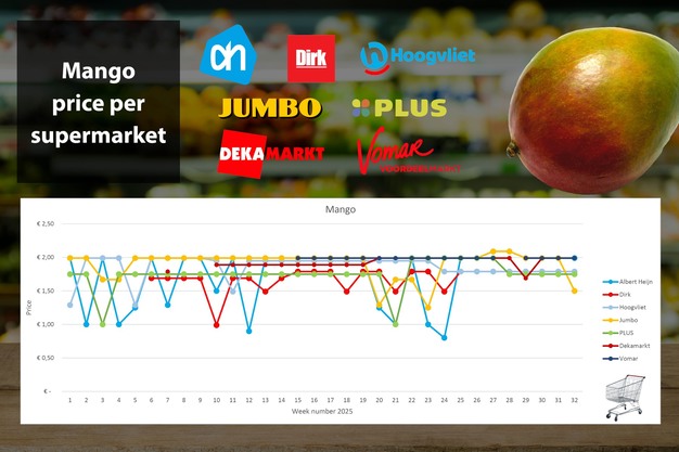 Al contrario dei mirtilli, i prezzi dei mango si mostrano estremamente stabili nelle ultime settimane. Dall'aggiornamento della settimana 29 non si notano variazioni nei supermercati, a eccezione di Jumbo, che offre il frutto a 1,50 euro.