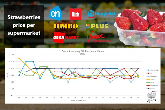 Anche i prezzi delle fragole restano relativamente stabili durante l'estate. Albert Heijn, Jumbo e Plus lo mantengono a 3,99 euro. Anche DekaMarkt è salito a 3,99 euro. Dirk e Hoogvliet restano invece un euro al di sotto. Per la settimana 32, tuttavia, Albert Heijn e Jumbo hanno deciso di promuovere le fragole rispettivamente a 2,74 e 2,79 euro.