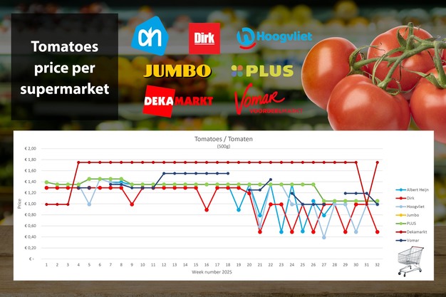 I prezzi dei pomodori restano intorno a 1 euro nella maggior parte dei supermercati. Solo DekaMarkt, dopo il forte calo nella settimana 31, ha deciso di riportarli a 1,75 euro. Inoltre, per la settimana 32, Dirk propone i pomodori a 0,49 euro.