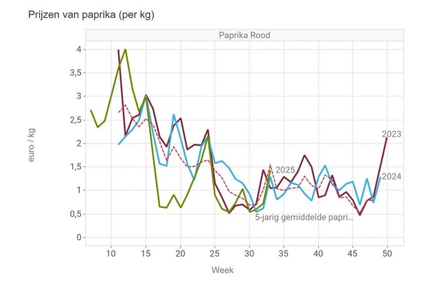 Anche i prezzi dei peperoni gialli e rossi sono saliti bruscamente nella settimana 33. Dalla Spagna si segnala domanda sia di pomodori sia, in particolare, di peperoni rossi. L'esportazione estiva di pomodori verso la Spagna non è una novità ed è da tempo legata al clima del sud e alla situazione colturale in loco. Per quanto riguarda i peperoni, il caldo sta mettendo in difficoltà anche i coltivatori spagnoli e, insieme ai problemi di malattie e parassiti, ciò contribuisce a creare una domanda spagnola di peperoni provenienti dal Belgio. Presso BelOrta, una delle cooperative del VBT, osservano che questa richiesta si sta mantenendo ormai da un po' di tempo.