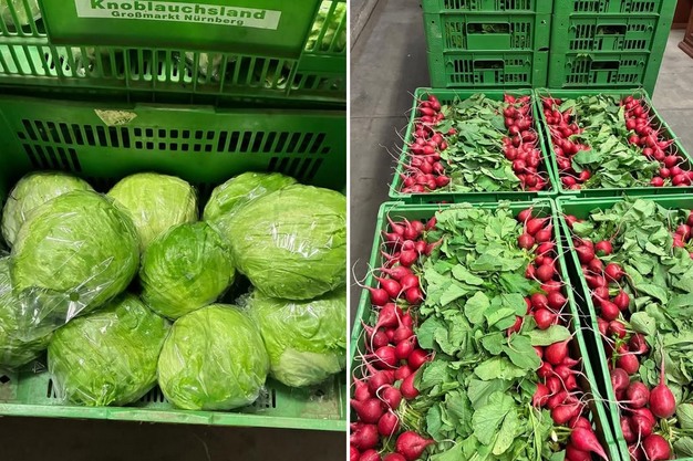 Lattuga iceberg e ravanelli della vicina regione di Knoblauchsland vengono acquistati dai partner del mercato all'ingrosso di Norimberga.