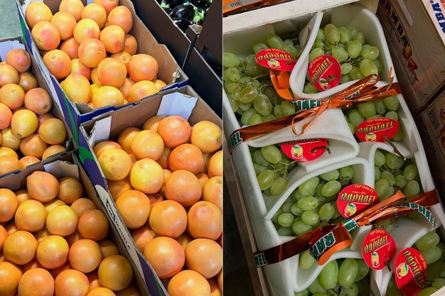 Assortimento di frutta: pompelmi di origine sudafricana (a sinistra) e uva da tavola italiana.