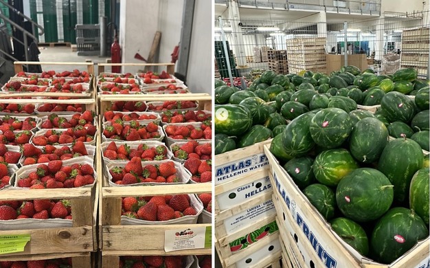 Frutta estiva in arrivo nel magazzino dell'azienda: fragole nazionali e angurie greche.