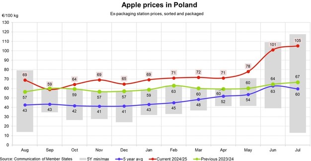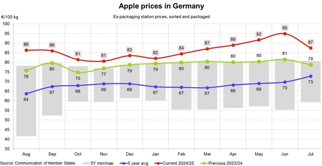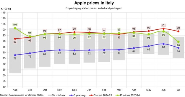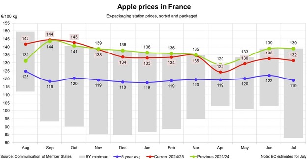 In Francia, si è registrata una lieve correzione al rialzo all'inizio dell'estate, ma con una stabilizzazione a luglio. I prezzi sono passati da 130 €/100 kg in maggio a 133 € in giugno, per poi calare leggermente a 132 € in luglio. Nonostante la flessione di metà stagione osservata in precedenza, i prezzi francesi delle mele rimangono pienamente entro la fascia di lungo periodo e vicini alla performance dello scorso anno.