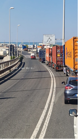 Foto a lato: lunghe file di camion in attesa per l'accesso alle strutture portuali.