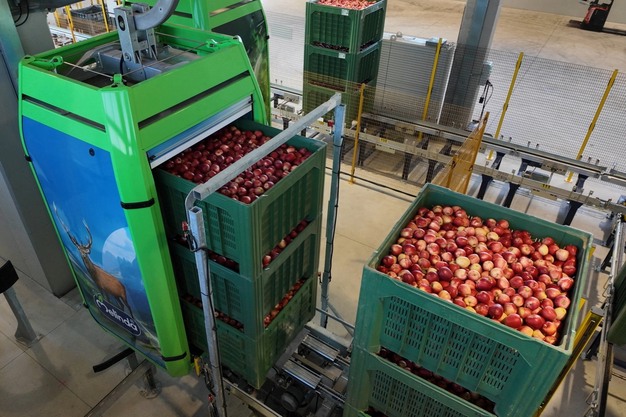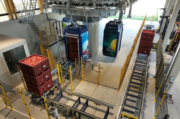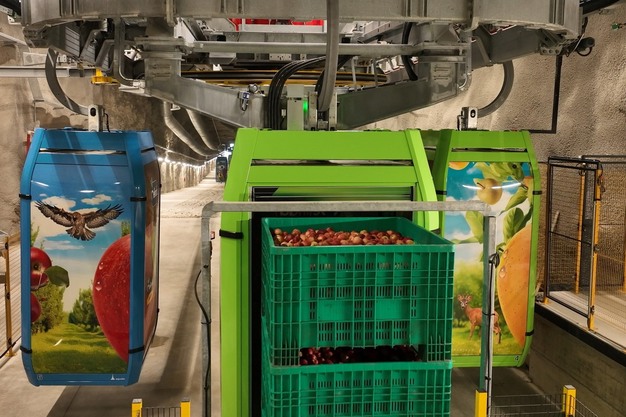 La funivia – lunga 1,3 chilometri e con un dislivello di quasi 90 metri – è in grado di trasportare ogni ora 460 contenitori da 300 chili ciascuno, viaggiando alla velocità di 5 metri al secondo. Le mele raggiungeranno così le celle ipogee ospitate nel cuore delle Dolomiti, dove la frigoconservazione naturale garantisce un risparmio energetico del 30% rispetto ai magazzini tradizionali.