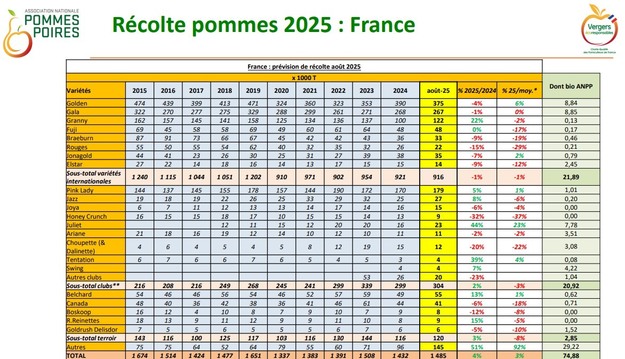 La produzione nazionale di mele è stimata in 1,485 milioni di tonnellate, ovvero il 4% in più rispetto al 2024 e il 3% in più rispetto alla media quinquennale. "Si tratta di una produzione leggermente superiore alla media, senza tuttavia essere eccessiva", spiega Vincent Guérin, responsabile degli affari economici dell'ANPP, aggiungendo che è probabile che le previsioni cambino a causa della pressione dell'Afide lanigero, particolarmente forte quest'anno.