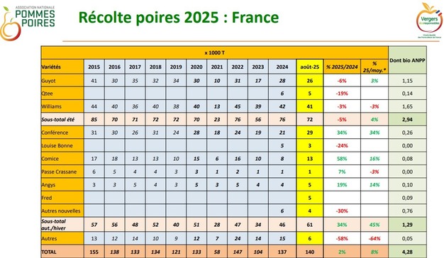 Per la stagione 2025/26, l'ANPP prevede 140mila tonnellate di pere, un livello "soddisfacente", superiore alla media e in leggero aumento rispetto allo scorso anno. Dopo un abbondante raccolto di pere estive nel 2024 (in particolare la varietà Guyot), la tendenza si inverte nel 2025: il segmento estivo registra un calo del 5%, mentre aumenta la produzione di pere autunnali e invernali, in particolare la varietà Conference. A livello europeo, il raccolto è stimato in 1,622 milioni di tonnellate (+2%) ma la situazione varia da Paese a Paese: l'Italia è in calo del 25% (forte calo per la Abate), il Portogallo resta lontano dal suo potenziale, mentre Paesi Bassi (+8%) e Belgio si stanno riprendendo dai minimi del 2024, con un raccolto inferiore per le pere estive (-14%).