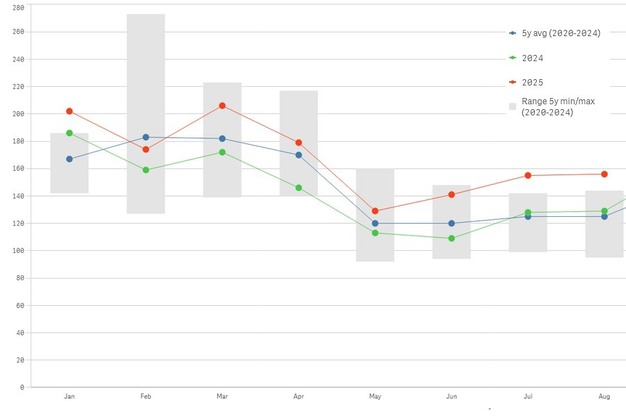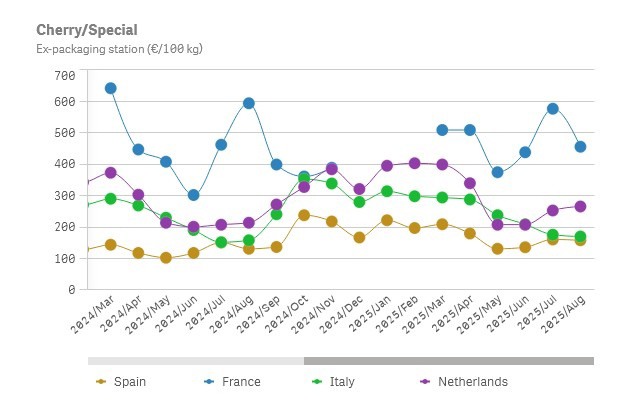 L'elevato prezzo medio non significa però che ovunque sul tomato dashboard della Commissione europea i valori risultino in crescita. In particolare nel segmento dei pomodori ciliegino e delle specialità si nota un calo dei prezzi rispetto a luglio. L'eccezione è rappresentata dai Paesi Bassi, con un prezzo medio di 2,66 euro/kg, ossia superiore dell'86% rispetto alla media quinquennale e del 24% rispetto a luglio.