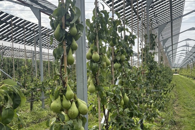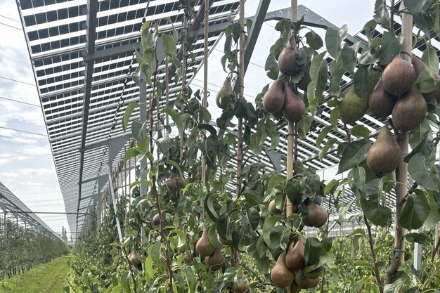 Nell'azienda frutticola olandese di Jan van Os, le pere stanno crescendo bene. La resa di quest'anno è superiore alle aspettative e Van Os attribuisce questo merito ai pannelli solari che proteggono i frutti dalla luce solare intensa e dalla grandine. I pannelli sono supportati da strutture in acciaio fornite dalla Trellex-RE, di Blokzijl (Paesi Bassi).