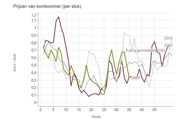 Alla fine della settimana 35, il prezzo medio dei pomodori a grappolo era ancora appena superiore alla soglia di 1 euro presso le aste dell'Associazione delle cooperative orticole belghe (VBT). I pomodori sfusi hanno fruttato in media 0,88 euro. Si tratta di quotazioni comunque superiori alla media e pari a quelli dello scorso anno, dopo un breve picco.