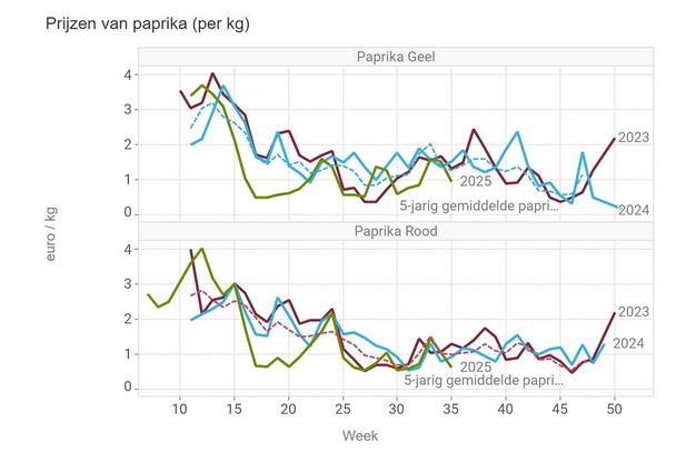 I prezzi medi dei peperoni rossi e gialli sono inferiori alla media quinquennale, anche se c'è stato un breve rialzo dei prezzi. Persino in piena estate le quotazioni erano già inferiori alla media quinquennale. I peperoni verdi hanno raggiunto il prezzo medio più alto nella settimana 35, con un prezzo al chilogrammo di oltre 1,18 euro.