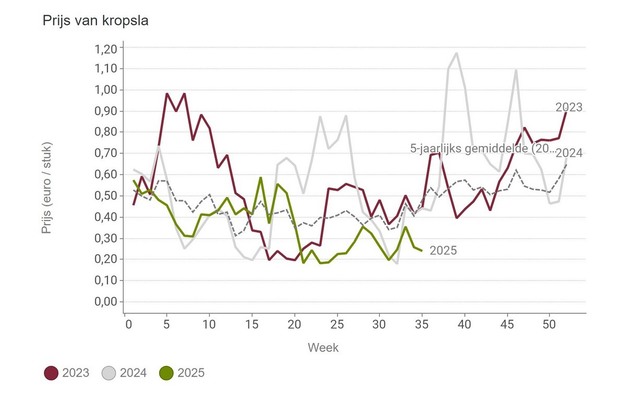 Il prezzo medio della lattuga non è riuscito a superare la media quinquennale quest'estate. Nella settimana 35, il prezzo a unità è nuovamente sceso.