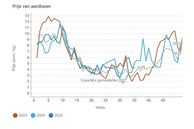 © VBT/Agentschap Landbouw en Zeevisserij – LandbouwcijfersIl prezzo medio delle melanzane (1,13 euro/kg nella settimana 35) è aumentato, mentre quello delle fragole (4,26 euro/kg) è superiore alla media quinquennale, dopo un inizio di luglio difficile dal punto di vista dei prezzi. "Il bel tempo ha favorito un'elevata produzione di melanzane, ma il prezzo è stato basso. Le melanzane sono molto sensibili alla domanda, che quest'anno è stata più limitata", afferma Boerenbond.